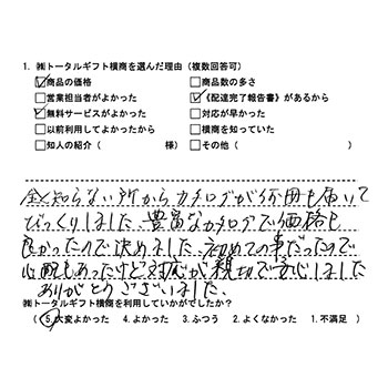 全く知らない所からカタログが何冊も届いてびっくりしました。豊富なカタログで価格も良かったので決めました。初めての事だったので心配もあったけど対応が親切で安心しました。ありがとうございました。