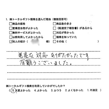 迅速・丁寧な対応に感謝です。お世話になりました。