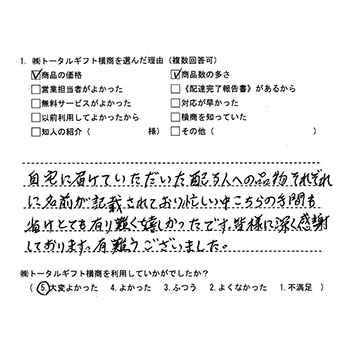 自宅に届けていただいた配る人への品物それぞれに名前が記載されており忙しい中こちらの手間も省けとても有難く嬉しかったです。皆様に深く感謝しております。有難うございました。