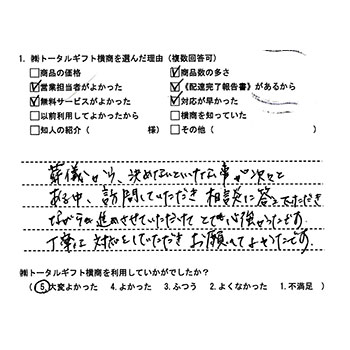 葬儀が終わり忌明選びまで早く終了し大変早く安心して四九日を向える事ができました。 |
