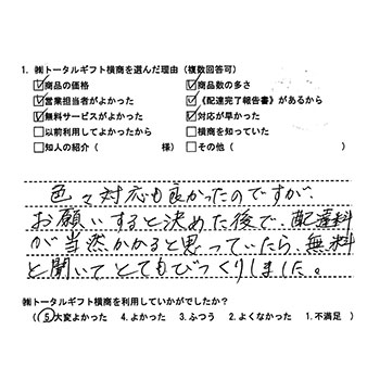色々対応も良かったのですが、お願いすると決めた後で、配達料が当然かかると思っていたら無料ときいてとてもびっくりしました。