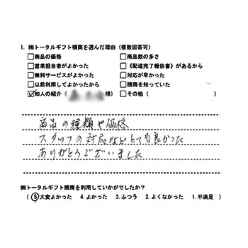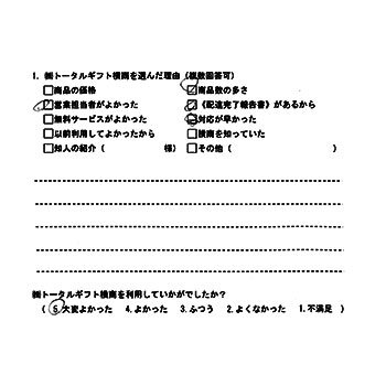 ![]() 商品の種類や価格、スタッフの対応などとても良かった。ありがとうございました。