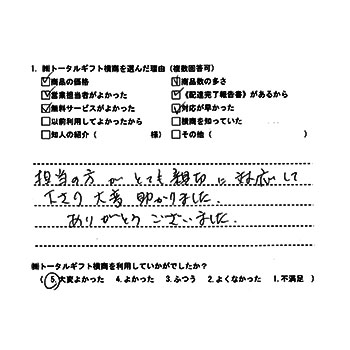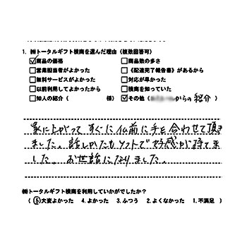 ![]() 20年前、父が亡くなった時はどこの業者に依頼したか忘れましたが、今回は自分が喪主で葬式後の忙しさを横商さんに助けていただきました。大変助かりました。ありがとうございました。