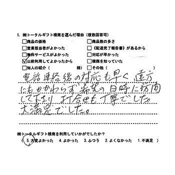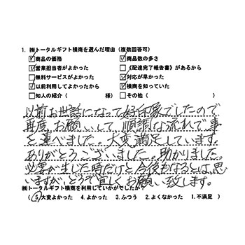 ![]() 以前お世話になって好印象でしたので再度お願いして順調な流れで事を運べました。大変満足しています。ありがとうございました。助かりました。必要が生じた時だけと今後もなるとは思いますが、どうぞ宜しくお願い致します。 |