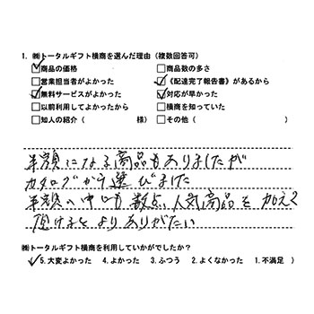 半額になる商品もありましたがカタログから選びました。半額の中にも数点人気商品を加えて頂けるとよりありがたい |