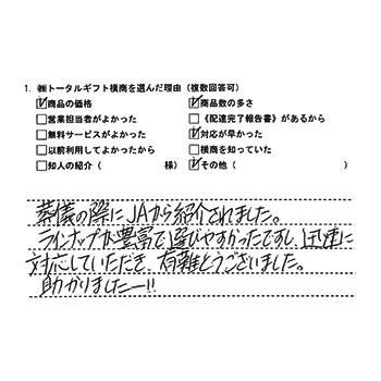葬儀の際にJAから紹介されました。ラインナップが豊富で選びやすかったですし、迅速に対応していただき有難うございました。助かりましたー!!