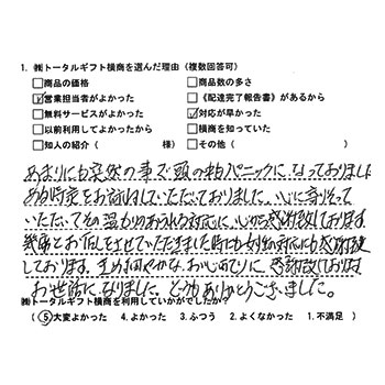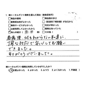 葬儀後、何もわからない私達に、丁寧な対応で安心してお願いできました。ありがとうございました。