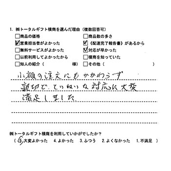 少額の注文にもかかわらず親切でていねいな対応に大変満足しました。 |