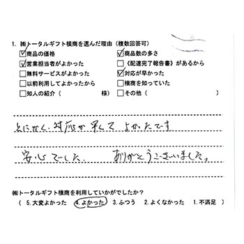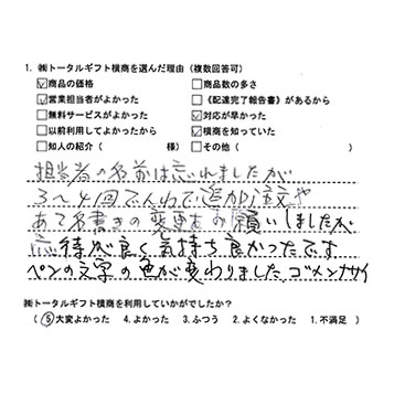 担当者の名前は忘れましたが3~4回でんわで追加注文やあて名書きの変更をお願いしましたが応対が良く気持ち良かったです。ペンの文字が変わりました、ゴメンナサイ。