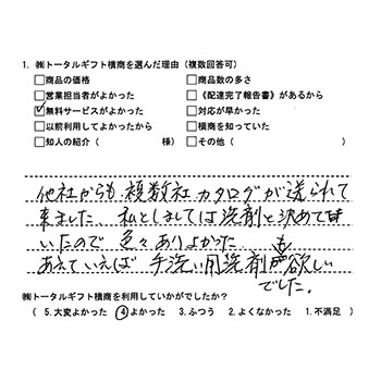 他社からも複数社カタログが送られて来ました。私としましては洗剤と決めていたので色々ありよかった。あえていえば手洗い用洗剤も欲しいでした。