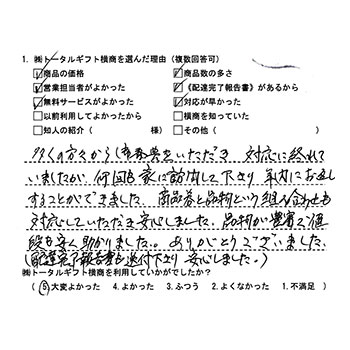 多くの方々から御香典をいただき対応に終われていましたが、何回も家に訪問して下さり年内にお返しすることができました。商品券と品物という組み合わせも対応していただき安心しました。品物が豊富で値段も安く助かりました。ありがとうございました。(配達完了報告書も送付くださり安心しました) |