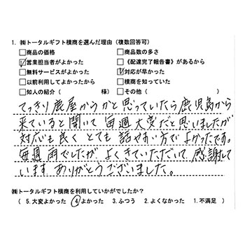 てっきり鹿屋からと思っていたら鹿児島から来ていると聞いて毎週大変だと思いましたが対応も良くとても話しやすい方でよかったです。毎週雨でしたが、よくきていただいて感謝しています。ありがとうございました。 |